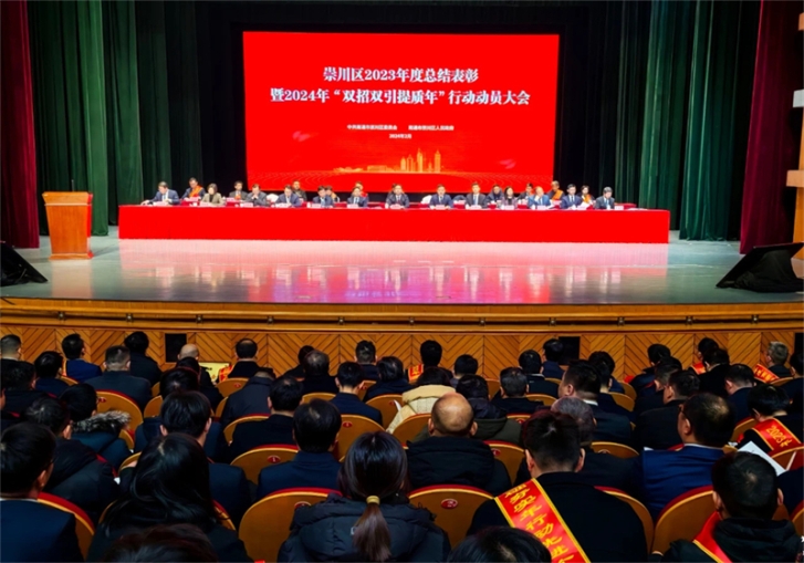 2月5日,,,,崇川区召开2023年度总结表扬暨2024年“双招双引提质年”行动发动大会,,,,发动全区上下以先进典范为模范,,,,以蛟龙出海的气焰、生龙活虎的劲头、龙腾万里的精神,,,,迅速掀起抓招商、攻项目热潮,,,,奋力拼抢首季“开门红”,,,,为“聚力‘新四年’、提升首位度”争做孝顺。。。区委书记胡拥军出席大会并讲话,,,,区委副书记、区长杨万平主持大会。。。