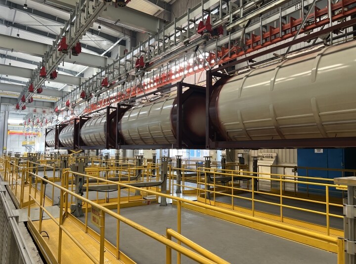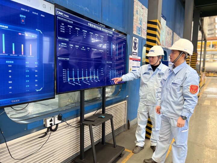 尊龙凯时标罐车间内,,,生产执行系统(MES)的使用,,,让治理者越发精准把控生产进度节点;;;;;去年投入运营的喷粉车间,,,较以往用工镌汰了60%以上、生产效率提高了40%以上,,,事情职员通过中控室的数字大屏,,,可随时相识车间生产运营、产量进度以及能耗管控等情形……